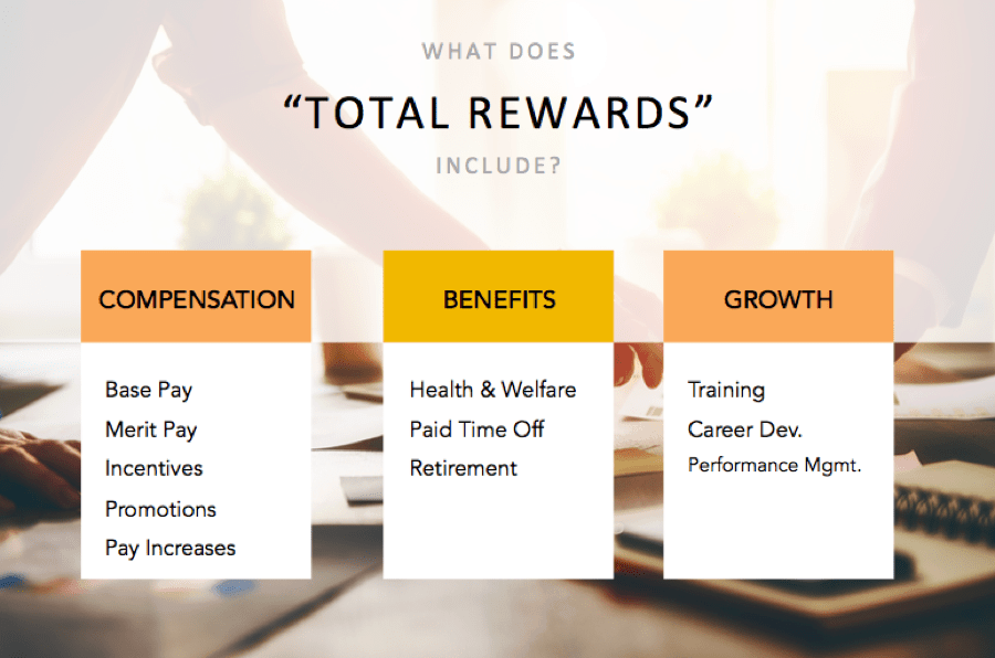 If you are part of an HR team or if you have a Human Resources team who helps organize your compensation structure, then you’re probably familiar with Total Rewards. The idea is that if employees are overall satisfied with their job and compensation, that they will perform at optimal levels.